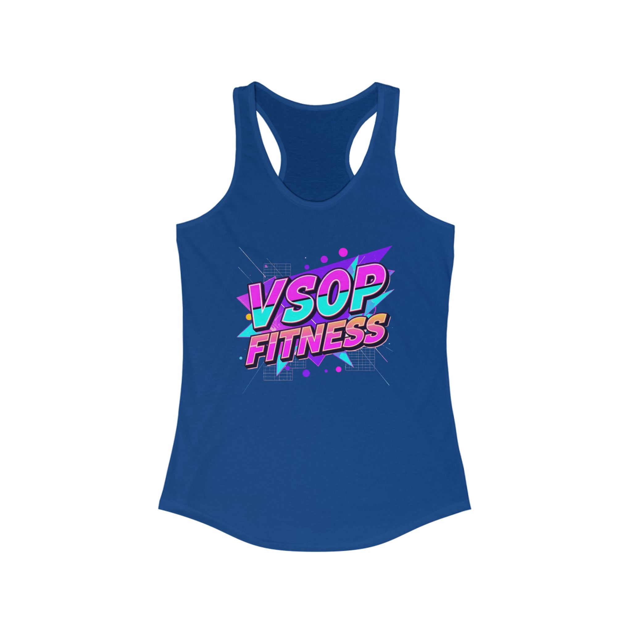 A women's tank top featuring a bold 90’s retro neon font design with electric pink, teal, and purple gradient, surrounded by geometric shapes. The fun and energetic vibe of this tank make it perfect for the active lifestyle, bringing a sporty touch to any outfit. Ideal for those who love 90's nostalgia and vibrant colors, this tank is great for workouts and casual wear. Perfect for summer days, festivals, and fitness enthusiasts.